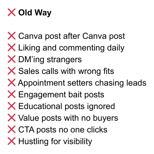 Posting every day. Showing up in stories. Engagement hacks. DMs. Funnels. Challenges.